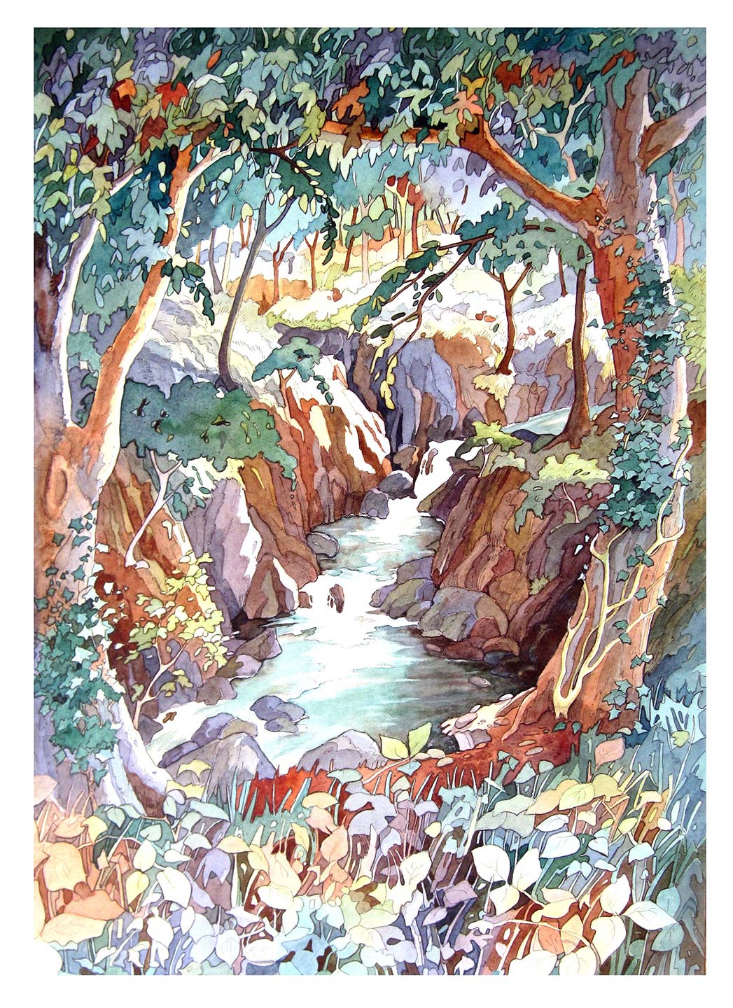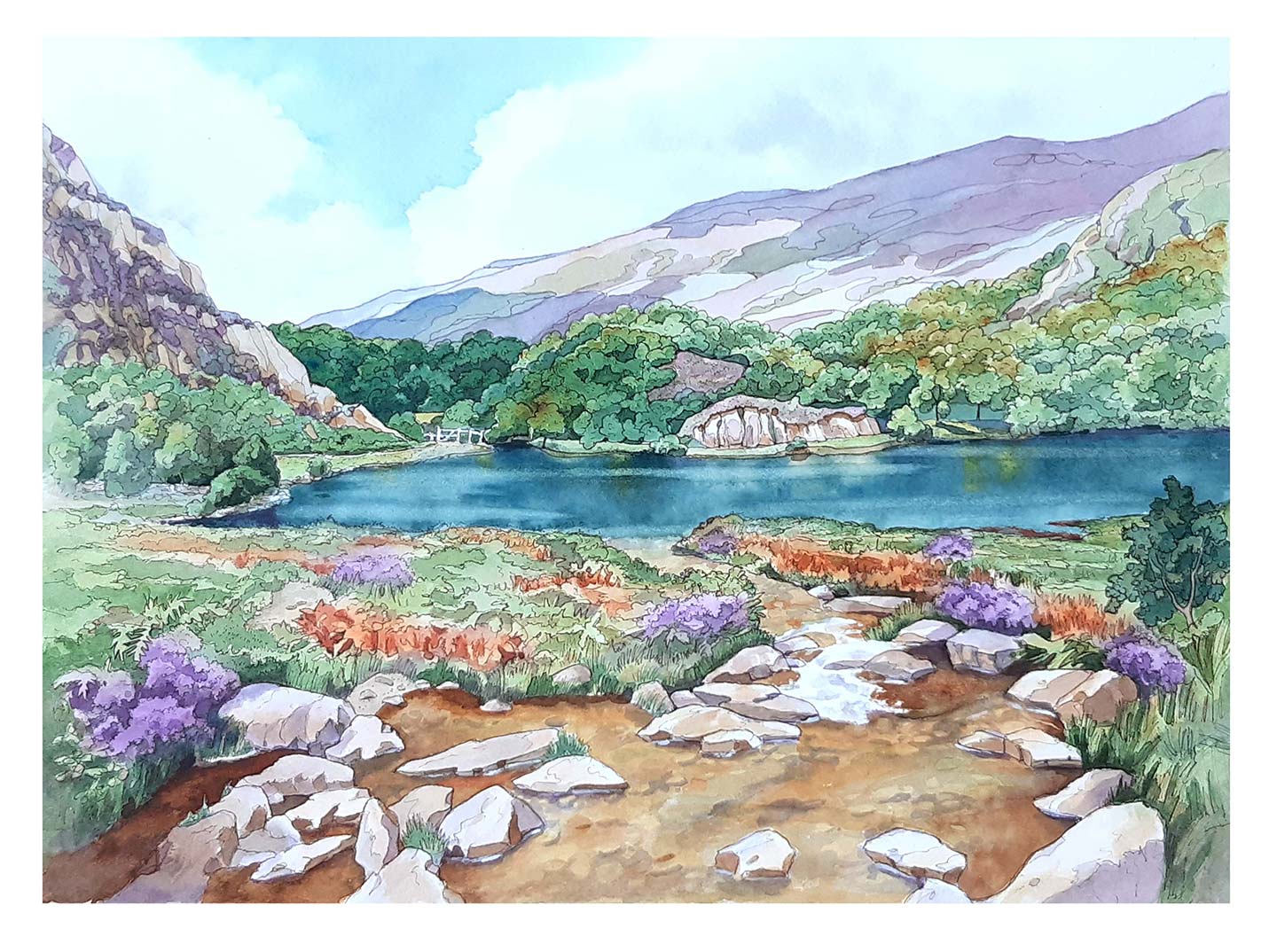 My work is mainly in watercolour or pen & watercolour. Drawing and painting are equally important to me. Combining the two techniques suits my inclination to draw and provides an underlying structure to the paintings which can be more loosely concluded with a limited palette of watercolour washes.