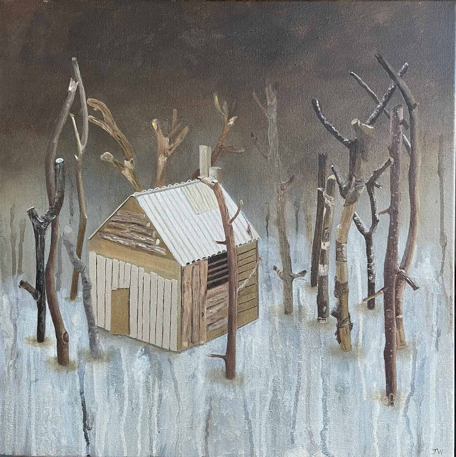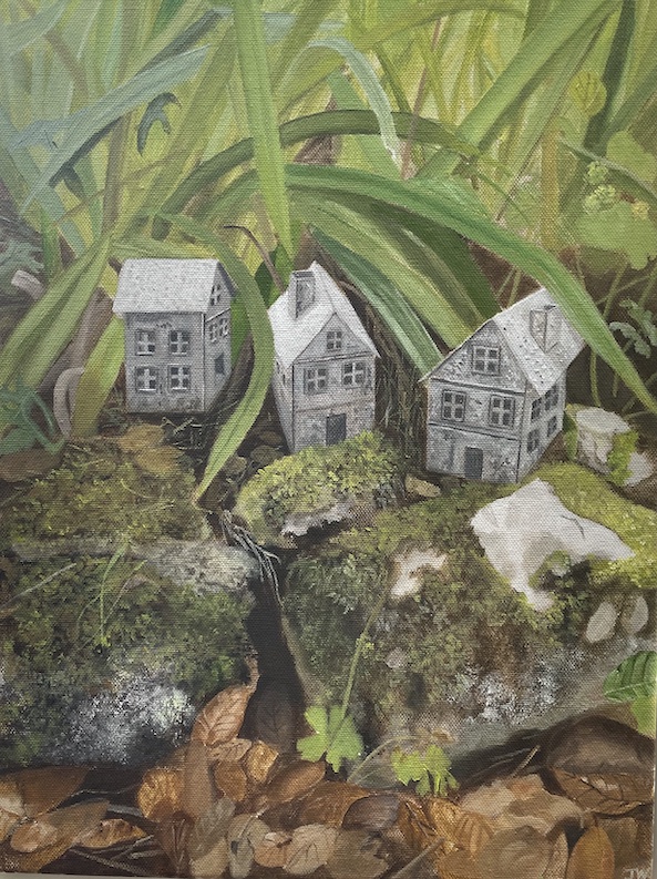 I often create table top still life arrangements of small buildings and landscapes constructed from card, plaster branches and model railway landscaping items. i will also use spot lamps to enhance the arrangement.